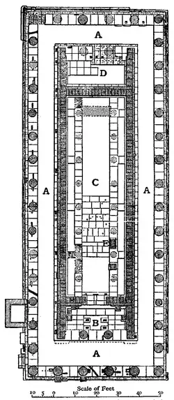 L'édifice est un temple dorique périptère (6 colonnes sur les façades, 16 sur les longs côtés, hautes de 5,40 m) de dimension moyenne et d'allure allongée (18,76 m de large pour 50,01 m de long pour un naos tripartite de 8,34 m sur 27,82 m). Pour lui donner quelque solennité, l'architecte l'a habillé d'un opisthodome distyle in antis, symétrique du pronaos[8]. Tout comme le temple de Zeus voisin, le sékos (espace intérieur du temple) est donc distyle in antis double (à la fois à l'est avec le pronaos et à l'ouest avec l’opisthodome), bien que l’opisthodome ne soit pas ouvert sur le naos.