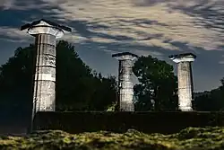 Ruines du temple d'Héra ayant fait l'objet d'une restauration partielle avec l'anastylose de quatre colonnes. | ||