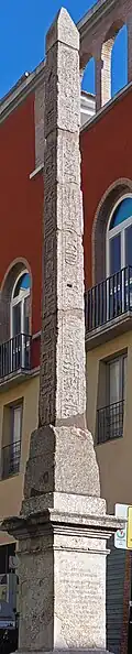 L'information sur le plus connu des deux obélisques commence en 1597, durant le pontificat du pape Clément VIII et de l'évêché de Massimiliano Palombara : cette année-là, il fut placé devant la cathédrale de Bénévent, couronné d'une boule de bronze avec une croix, et dédié à la Vierge[7]. Supprimé en 1867 à l'occasion de l'agrandissement du Corso Garibaldi, il fut repositionné en 1872 sur la petite place Emilio Papiniano, où il se trouve encore aujourd'hui, installé sur un piédestal portant une inscription en latin et en grec.