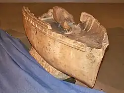 Il ne reste qu'un fragment substantiel de la coque, sur lequel se trouvent les pieds d'une figure féminine. La base de la coque est décorée d'un motif de vagues ; la coque est bien finie d'un seul côté. Les pieds sont de très bonne facture, chaussés de sandales entre les lacets desquelles se trouve un décor de feuilles. Le personnage, qui serait Isis, aurait soutenu la voile du navire, en métal. L'œuvre pourrait provenir de Délos, où l'on trouve un bas-relief avec une figure similaire[15],[16].