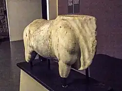 La tête et les extrémités de cette très grande statue (1,25 m de long) ont été perdues. L'identification avec Apis serait justifiée par la similitude avec un spécimen en bronze d'Herculanum , mais elle n'est pas unanimement reconnue. Cette représentation, tout en rappelant celle égyptienne, est revisitée avec un naturalisme hellénistique détaillé. La tête était dressée, une patte avant relevée, les organes génitaux bien visibles[17].