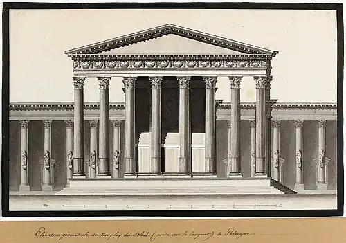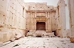 Une colonnade encercle la cella dont huit colonnes finement cannelées subsistaient avant la destruction. D'une hauteur de 15,81 m, elle est interrompue par une porte monumentale à l'Est qui précède l'entrée du sanctuaire et qui n'est pas centrée mais légèrement déportée vers un angle de l’édifice. Cette particularité architecturale est sans équivalent dans l'art du Proche-Orient antique. D'autre part, une abondance de merlons ou créneaux viennent surmonter le toit de la rangée de colonnes[4]. Les chapiteaux corinthiens en bronze doré qui ornaient les colonnes ont tous disparu mais des trous de fixations visibles sur les blocs de maintien démontrent une ornementation en placage.