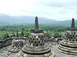 Après avoir traversé les quatre galeries, le pèlerin atteint la terrasse supérieure, elle aussi surmontée de trois terrasses circulaires concentriques bordées de 72 stûpas (respectivement 32, 24 et 16). Ils consistent en des cloches de pierre ajourées logeant des bodhisattvas. Au centre de ces terrasses et donc au sommet du Borobudur, un autre stûpa couvre un bouddha inachevé, dont on ignore s'il a été rajouté après coup ou s'il était présent à l'origine.