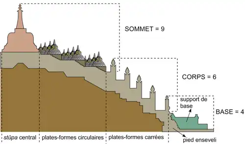 La division en trois parties du monument représente également les trois étapes de la préparation mentale pour accéder à l'illumination dans la cosmologie bouddhiste, respectivement de manière ascendante : Kāmadhātu (le monde des désirs), Rupadhatu (le monde des formes) et Arupadhatu (le monde sans forme)[17]. Ces différences métaphoriques se retrouvent dans l'architecture et les décorations de chaque étage : détaillées à la base, circulaires au niveau du corps et lisses au niveau du sommet[18].