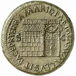 (fr) « Il [Numa Pompilius] éleva le temple de Janus. Ce temple, construit au bas de l'Argilète, devint le symbole de la paix et de la guerre. Ouvert, il était le signal qui appelait les citoyens aux armes; fermé, il annonçait que la paix régnait entre toutes les nations voisines. Deux fois il a été fermé depuis le règne de Numa, la première, sous le consulat de Titus Manlius, à la fin de la première guerre punique, la seconde, sous César Auguste, lorsque, par un effet de la bonté des dieux, nous vîmes, après la bataille d'Actium, la paix acquise au monde, et sur terre et sur mer[3]. » — Tite-Live, Histoire Romaine