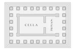 Les premières reconstitutions du temple basées sur une observation précise des vestiges donnent un temple de six colonnes en façade et neuf latérales, quasiment pycnostyle, c'est-à-dire que la distance entre les colonnes est équivalente à une fois et demi leur diamètre, sur une crépis de quatre marches. La cella devait être presque deux fois plus longue que large[14]. Les archéologues allemands Brunn et Jordan estiment le diamètre des colonnes à la base entre 1,15 et 1,25 mètre avec un écartement entre l'axe des colonnes de 2,66 mètres. Les colonnes sont donc plus resserrées que dans le plan type du temple pycnostyle tel que définit par Vitruve[15]. Le tambour inférieur du fût rainuré des colonnes est taillé dans le même bloc de marbre du Pentélique que la base constituée d'un unique tore, rappelant l'élément supérieur d'une base ionique[13].