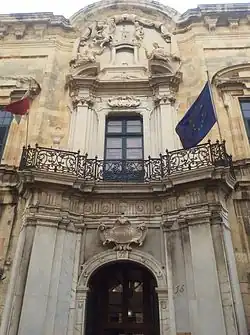 Un grand bloc de marbre a été réutilisé pour servir de base au bas-relief visible à l'entrée principale de l'Auberge d'Italie[1] : vers 1680, le sculpteur La'Fe y grave les armes du grand maître Gregorio Carafa[13].