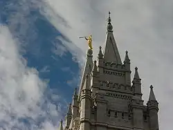 Il a été le premier temple orné à son sommet de l’imposante statue de l’ange Moroni créée par le sculpteur formé à Paris, Cyrus E. Dallin. Précédemment, le temple de Nauvoo (en) supportait une girouette figurant un ange volant. L’installation d’autres statues se poursuivra par la suite sur presque tous les temples d’après ce schéma. L'ange Moroni représente un messager de la restauration de l'évangile et un héraut de la seconde venue de Jésus-Christ : « le Fils de l'homme viendra, et il enverra ses anges avant lui, avec un grand bruit de trompette, et il rassemblera ses élus des quatre coins de la terre » (JS-M 1:37).