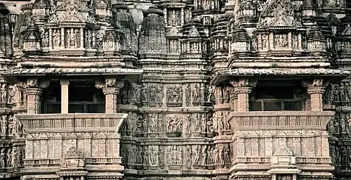 La partie extérieure au-dessus de la base comporte trois bandeaux de sculptures de diverses divinités, des surasundari (figures féminines) comme des apsara (nymphes célestes) et des créatures mythiques.