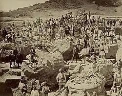 Un Grec, que M. Dubois avait repoussé, s'attacha à moi, et, probablement en vue du pourboire, voulut me conduire à un endroit que sa pantomime me faisait supposer devoir être très-curieux. « Allez-y, si vous voulez, me dit M. Dubois; mais il va vous mener à quelque ruine romaine sans intérêt. » Je suivis donc mon guide jusque dans une partie de la plaine presque inabordable, couverte d'arbustes, d'herbes, de pierres énormes, mais sans forme, et qui sortaient de terre à égale distance. Cet amas confus de matériaux de toutes sortes me parut cependant mériter l'attention. Je rejoignis M. Dubois, que je trouvai dépité de n'avoir rencontré que des ruines peu intéressantes, fort mal conservées, et rien qui parût devoir amener quelque découverte. Mon récit le fit réfléchir : il se dirigea, avec Trézel et moi, vers le lieu que je venais de voir, et décida sur-le-champ que les fouilles seraient commencées là. »— Amaury-Duval 1885, p. 131 et 132 (chapitre IX – Installation à Olympie).