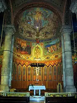 Depuis la crypte on accède à une chapelle consacrée à l'Adoration Perpétuelle, excavée dans la même montagne à la fin des années 1940, formée de trois nefs divisés par des colonnes. L'intérieur est ornementé de marbres et mosaïques sur le pavement et des peintures de Miquel Farré sur les murs, réalisées entre 1947 et 1949[15]. L'église est couronnée par l'énorme statue en bronze du Sacré Cœur faite par Josep Miret en 1950 en remplacement de l'original de Frederic Marès de 1935, détruite au début de la Guerre d'Espagne, en 1936. Le sens ascensionnel depuis la crypte, en passant par le temple jusqu'à la sculpture, reflète l'ascension et la purification de la condition humaine par l'intermédiaire du sacrifice et l'expiation[16].