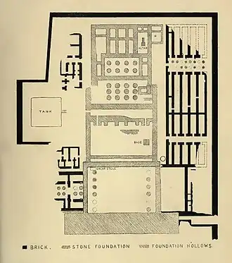 Le complexe funéraire mesure environ cent-vingt mètres de long pour cent mètres de large. La partie principale, construite en pierre (calcaire et grès), est organisée selon un plan relativement classique : un premier pylône ouvre sur une première cour, puis un second pylône donne accès à une autre cour. Depuis la seconde cour, on accède à l'intérieur du temple. Celui-ci se compose de deux salles hypostyles successives et finalement du sanctuaire. Le reste du temple a été construit en briques et se compose d'un palais et de diverses pièces de stockage et d'entretien[8],[2].
