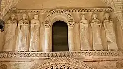 La partie la plus intéressante est cependant la frise du niveau supérieur, librement superposée aux éléments architecturaux du bâtiment tels que les fenêtres. Six figures en relief de Saints, en stuc, sont exceptionnellement bien conservées : leurs figures monumentales sont à rapprocher des modèles classiques, réinterprétés selon la culture lombarde. Les drapés des robes richement décorées ont un motif rectiligne accentué, rappelant les modèles byzantins[1], dont les Saints se distinguent cependant par le plus grand sens du volume et par le verticalité, encore marqué par la longueur des plis des tuniques[6].