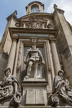 En 1889, à l'occasion du centenaire de la Révolution et de l'Exposition universelle de Paris, une statue à Gaspard II de Coligny est élevée par souscription publique au chevet du temple, au 160 rue de Rivoli. L'ensemble du monument est réalisé suivant les plans de l'architecte Louis Henri Georges Scellier de Gisors par le sculpteur Gustave Crauk (1827-1905). La statue de l'amiral de Coligny est entourée de celles représentant la Patrie et la Religion. La première rappelle l'organisation de la défense de la France après la défaite de Saint-Quentin, en 1557, la seconde, la position de Coligny comme chef du parti protestant. Une plaque rappelle son assassinat le , le premier du massacre de la Saint-Barthélemy.