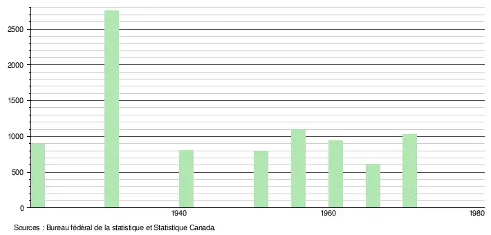 - ↑ Bureau fédéral de la statistique, recensements du Canada pour les années 1921, 1931, 1941, 1951, 1956, 1961 et 1966.