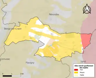 La commune est vulnérable au risque de mouvements de terrains constitué principalement du retrait-gonflement des sols argileux[14]. Cet aléa est susceptible d'engendrer des dommages importants aux bâtiments en cas d’alternance de périodes de sécheresse et de pluie. 80,8 % de la superficie communale est en aléa moyen ou fort (90 % au niveau départemental et 48,5 % au niveau national). Sur les 59 bâtiments dénombrés sur la commune en 2019, 43 sont en aléa moyen ou fort, soit 73 %, à comparer aux 83 % au niveau départemental et 54 % au niveau national. Une cartographie de l'exposition du territoire national au retrait gonflement des sols argileux est disponible sur le site du BRGM[15],[Carte 2].
