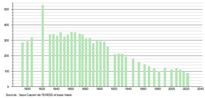 L'évolution du nombre d'habitants est connue à travers les recensements de la population effectués dans la commune depuis 1793. Pour les communes de moins de 10 000 habitants, une enquête de recensement portant sur toute la population est réalisée tous les cinq ans, les populations de référence des années intermédiaires étant quant à elles estimées par interpolation ou extrapolation[19]. Pour la commune, le premier recensement exhaustif entrant dans le cadre du nouveau dispositif a été réalisé en 2006[20].
