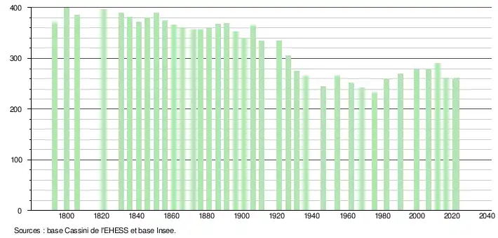 L'évolution du nombre d'habitants est connue à travers les recensements de la population effectués dans la commune depuis 1793. Pour les communes de moins de 10 000 habitants, une enquête de recensement portant sur toute la population est réalisée tous les cinq ans, les populations de référence des années intermédiaires étant quant à elles estimées par interpolation ou extrapolation[35]. Pour la commune, le premier recensement exhaustif entrant dans le cadre du nouveau dispositif a été réalisé en 2006[36].
