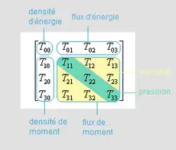 - Tij est la composante j du flux de la composante i de l'impulsion relativiste[18]. Les composantes Tij sont celles du tenseur des contraintes dans l'espace[17].