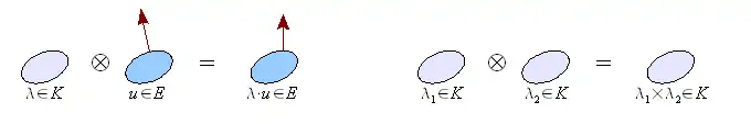 On notera que le produit tensoriel généralise le produit par un scalaire défini sur les -espaces vectoriels ainsi que le produit dans le corps . On a ainsi et .