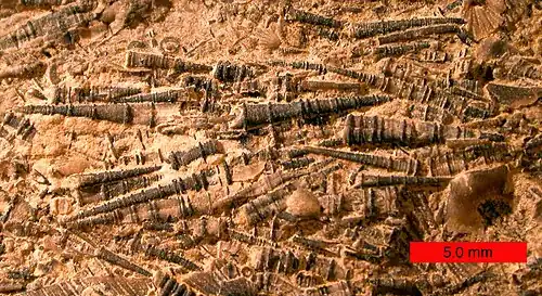 Tentaculites est un genre éteint d'animaux marins vivants dans des tubes calcaires. Ils sont aujourd'hui plutôt considérés comme des brachiozoaires, un clade qui regroupe les brachiopodes et les phonoridiens.