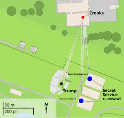 Un membre de l'équipe tactique de l'unité des services d'urgence du comté a vu Crooks sur le toit et il a averti d'autres services de sécurité. Un policier qui a photographié Crooks rapporte l'avoir vu « examiner » le toit du bâtiment avec un télémètre. Ensuite, des agents du Secret Service ont repéré Crooks sur le toit environ 20 minutes avant la fusillade[53]. Un officier de la police municipale a voulu monter sur le toit, mais Crooks a pointé son arme dans sa direction et l'officier a reculé[54], puis il est tombé de plus de deux mètres de haut et s'est blessé à la cheville. C'est juste après cette interaction avec le policier municipal que Crooks a tiré dans la direction de l'ex-président[55]. Des snipers du Secret Service ripostent et tuent Crooks (cf. image plus haut), 26 secondes après le premier tir de l'assaillant[56].