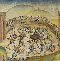 À gauche, autour d'un enclos, des spectateurs assistent à une tentative drolatique de mise à mort d'un sanglier par une douzaine d'hommes en armure. L'aspect parodique de cette « chasse » est renforcé par les cimiers grotesques de plusieurs d'entre eux (soufflet, assiette, cruchon...). Cette scène représente un divertissement cruel auquel on faisait participer des aveugles : s'ils parvenaient à tuer un cochon attaché sans s'assommer entre eux, ils pouvaient manger l'animal. L'existence de ce jeu est attestée, par exemple, lors du mardi gras de 1386 à Lübeck[24]. Représenté dans un dessin de Jan Verbeeck (frère de Frans) conservé à l’École des Beaux-arts de Paris[25], il était aussi le sujet d'une toile aujourd'hui disparue, attribuée à Bosch et achetée en 1570 par Philippe II d'Espagne aux héritiers de l'humaniste Felipe de Guevara[26]. Dans la tapisserie de Saint Martin, la scène du sanglier pourrait faire allusion à un proverbe flamand : « Op Sint Martijn, slacht de arme het zwijn » (« À la Saint-Martin, le pauvre tue son cochon »)[27].