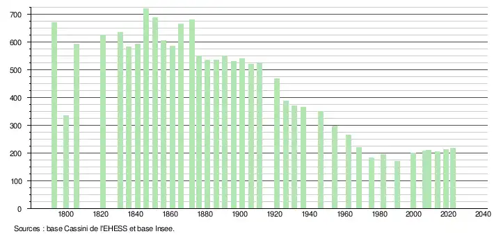 L'évolution du nombre d'habitants est connue à travers les recensements de la population effectués dans la commune depuis 1793. Pour les communes de moins de 10 000 habitants, une enquête de recensement portant sur toute la population est réalisée tous les cinq ans, les populations de référence des années intermédiaires étant quant à elles estimées par interpolation ou extrapolation[21]. Pour la commune, le premier recensement exhaustif entrant dans le cadre du nouveau dispositif a été réalisé en 2008[22].