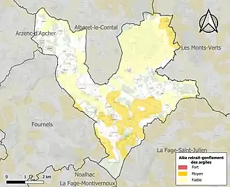 Le retrait-gonflement des sols argileux est susceptible d'engendrer des dommages importants aux bâtiments en cas d’alternance de périodes de sécheresse et de pluie. 18,1 % de la superficie communale est en aléa moyen ou fort (15,8 % au niveau départemental et 48,5 % au niveau national). Sur les 156 bâtiments dénombrés sur la commune en 2019, 44 sont en aléa moyen ou fort, soit 28 %, à comparer aux 14 % au niveau départemental et 54 % au niveau national. Une cartographie de l'exposition du territoire national au retrait gonflement des sols argileux est disponible sur le site du BRGM[18],[Carte 2].