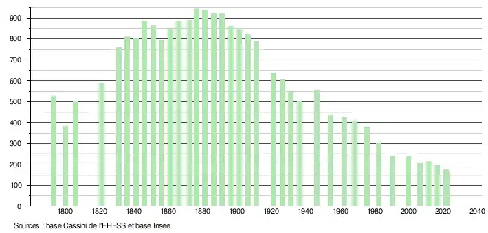 L'évolution du nombre d'habitants est connue à travers les recensements de la population effectués dans la commune depuis 1793. Pour les communes de moins de 10 000 habitants, une enquête de recensement portant sur toute la population est réalisée tous les cinq ans, les populations de référence des années intermédiaires étant quant à elles estimées par interpolation ou extrapolation[29]. Pour la commune, le premier recensement exhaustif entrant dans le cadre du nouveau dispositif a été réalisé en 2006[30].