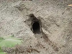 - certains oiseaux ; les oiseaux fouisseurs sont souvent dépendants de l'eau. Ils creusent généralement leur terrier dans du sable ou des matériaux assez faciles à creuser, dans de petites falaises ou berges. C'est le cas de l'Hirondelle de rivage, du macareux, du martin pêcheur et du guêpier par exemple, ou encore de certains pingouins et d'autres oiseaux pélagiques ; les Manchots de Magellan (Spheniscus magellanicus) creusent ainsi leurs terriers le long du littoral de Patagonie[2].