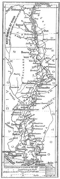 - ↑ Bondoukou est la capitale de Gyaman et un carrefour commercial traditionnel établi depuis l'arrivée des Européens dans cette partie de l'Afrique comme une étape dans le commerce entre la côte maritime et les routes caravanières transsahariennes au nord. Il y avait aussi de riches champs aurifères près de Bondoukou près d'Assikasso, qui étaient considérés comme des centres de production d'or bien avant l'époque coloniale. A cette époque, Bondoukou faisait partie du protectorat français
