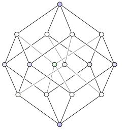 - 4-dimensions : Deux cubes parallèles ABCDEFGH et IJKLMNOP peuvent être connectés pour devenir un hypercube, avec les coins marqués ABCDEFGHIJKLMNOP.
