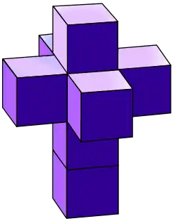 La projection parallèle cellule en premier du tesseract dans un espace tridimensionnel a une enveloppe cubique. Les cellules les plus proches et les plus éloignées sont projetées sur le cube, et les 6 cellules restantes sont projetées sur les 6 faces carrées du cube.