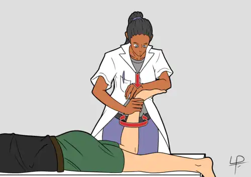 - Installation du patient : identique à celle du test de compression, mais en plus, l'examinateur immobilise la cuisse du patient, à l'aide de sa main libre ou de son genou.