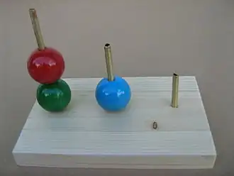 Sur le plus grand piquet on peut insérer les trois boules, sur le moyen, deux boules et sur le petit piquet, une seule boule. Les boules peuvent ainsi être arrangées sur les piquets de façon à former différents modèles (cf."Target Stacks" sur la figure 2)[1].