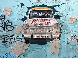 Elle représente une trabant, voiture emblématique de l'Allemagne de l'Est pendant la Guerre froide.