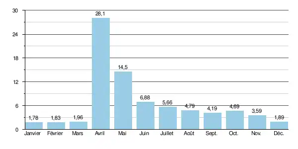 Le débit moyen mensuel observé en janvier (minimum d'étiage) est de 1,78 m3/s, soit environ 6 % du débit moyen du mois de mai (28,1 m3/s), ce qui montre l'amplitude assez élevée des variations saisonnières. Sur la durée d'observation de 31 ans, le débit mensuel minimal a été de 0,23 m3/s (230 l/s) en , tandis que le débit mensuel maximal s'élevait à 103 m3/s en .