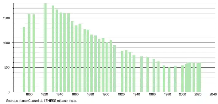 L'évolution du nombre d'habitants est connue à travers les recensements de la population effectués dans la commune depuis 1793. Pour les communes de moins de 10 000 habitants, une enquête de recensement portant sur toute la population est réalisée tous les cinq ans, les populations de référence des années intermédiaires étant quant à elles estimées par interpolation ou extrapolation[48]. Pour la commune, le premier recensement exhaustif entrant dans le cadre du nouveau dispositif a été réalisé en 2004[49].