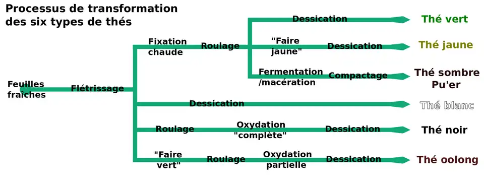 Cette boisson aqueuse est obtenue à partir de feuilles séchées ayant des niveaux d'oxydation et de fermentation différents qui déterminent les caractéristiques du thé produit. Les thés obtenus sont différenciés par leur « couleur ». Ainsi, un thé non oxydé est appelé thé vert, un thé oxydé est appelé thé blanc (oxydation faible), thé Oolong ou bleu (oxydation intermédiaire) ou thé noir (oxydation complète), et un thé ayant subi une fermentation est appelé thé jaune (fermentation légère) ou thé sombre (maturation longue).