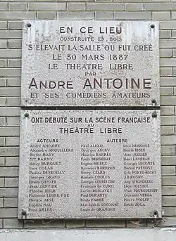 En 1887, le Théâtre-Libre s'installa dans la salle des Menus-Plaisirs, dans le 10e arrondissement, la propriétaire des murs ayant enfin offert des conditions acceptables à André Antoine. Mais en 1894, le directeur du théâtre, en période de difficulté, ayant cédé à l'un de ses comédiens, Antoine Larochelle, le nom Théâtre-Libre, il dut rouvrir ses portes sous un autre nom. Ce sera le théâtre Antoine où l'activité du Théâtre-Libre se poursuivit avec des auteurs tels que Courteline, Tolstoï, Balzac[2], Giovanni Verga, Ivan Tourgueniev, et où furent jouées des œuvres inédites d'écrivains tels que les frères Goncourt, Paul Claudel et Villiers de L'Isle Adam. Dans ses premières années d'activité, le Théâtre-Libre présenta un très grand nombre d'œuvres inédites ou composées par de jeunes auteurs dramatiques, bien plus que la Comédie-Française et le Théâtre de l'Odéon réunis. On peut citer encore Jules Lemaître, Jules Renard, Anatole France et Marie Lenéru (presque aveugle, atteinte de surdité dès l'âge de quinze ans), qui produisit son Journal et un essai sur Saint-Just. Parmi les acteurs se trouvait Lucien Guitry[3].