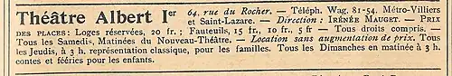 Théâtre Albert 1er: prix des places et administration en 1925.