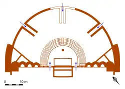 Les angles du théâtre sont renforcés par de puissants massifs de maçonnerie, ce qui porte le diamètre de la cavea à 67 m et des murs de soutènement sont construits à l'intérieur de la cavea dont ils coupent les angles ; ces dispositifs visent sans doute à compenser l'excès de poids dû aux gradins en grès[11]. Dans cette configuration, la capacité du théâtre est estimée à 3 500 spectateurs[12].