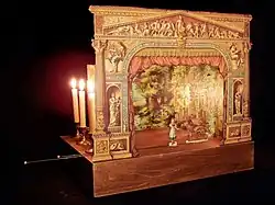 Il s'agit d'un théâtre à l'italienne miniature tenant en général sur une table. Les figurines sont à l'échelle du théâtre. Elles sont actionnées par des tirettes en carton ou en fer latéralement par le narrateur qui se tient généralement derrière la table[1]. Très populaire au XIXème siècle, tombé dans l'oubli au début du XXème, le théâtre de papier est maintenant pratiqué dans de nombreux festivals et associations et reprend place, peu à peu, dans les mœurs culturelles du XXIe siècle[2]. Chacun pouvait acheter des façades de théâtre, des décors, des figurines, les coller sur du carton et les assembler. Il existait quantité d'imprimeurs en Grande-Bretagne, en France, en Allemagne et au Danemark . Les planches étaient en couleurs ou en noir et blanc, à charge pour l'acheteur de les colorier à l'aquarelle ou autre. On pouvait acheter aussi des textes pour jouer des grands classiques adaptés de Shakespeare (Othello, Richard III), de Dumas (Les Frères corses), de Jules Verne (Le Tour du monde en 80 jours) de Carl Maria von Weber (Der Freischütz) ou simplement des contes pour enfants comme Aladin et la lampe merveilleuse, La Belle et la Bête.