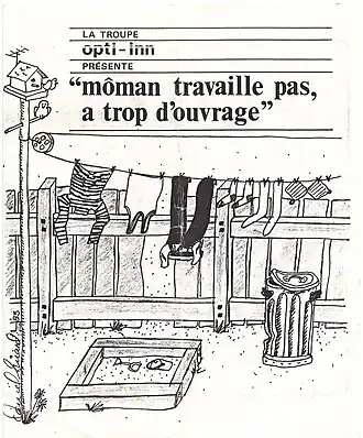 Môman travaille pas, a trop d’ouvrage! est présentée pour la première fois le 8 mars 1975, à l’occasion de la Journée internationale des femmes de cette année-là. Cette deuxième création traite du travail ménager/invisible des femmes[4]. Il s'agit du premier livre publié par les éditions féministes québécoises remue-ménage.