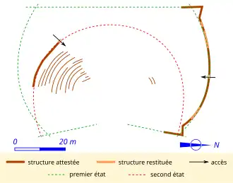 Un mur courbe, au nord, percé d'une entrée, se termine à ses deux extrémités occidentale et orientale par des maçonneries en renvoi d'équerre, peut-être destinées à servir de contreforts, cette partie du théâtre étant bâtie parallèlement aux courbes de niveau. Au sud, un autre mur, constitué semble-t-il de segments de droites assemblés, comporte lui aussi à une de ses extrémités un dispositif de franchissement[5].