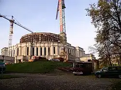 C’est en 1934 que commence la construction colossale du nouveau bâtiment de style constructiviste, selon un projet du célèbre architecte soviétique Iossif Langbard. Les travaux prennent place sur le lieu historique du marché de la Trinité et durent cinq ans. À noter que les plans initiaux sont modifiés en 1937 pour diminuer les dépenses et, par conséquent, les dimensions du bâtiment. Enfin, ce dernier est inauguré le .