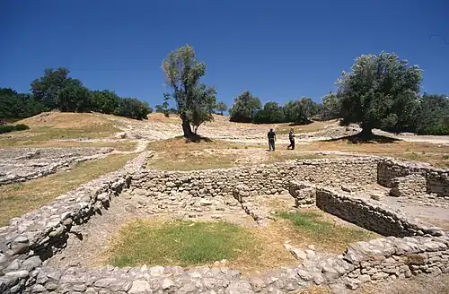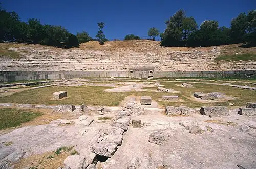 Les marches étaient taillées dans la pierre tendre locale et divisées en sept coins ou secteurs (kerkìdes), à l'aide de six marches (klimakes). Une cloison horizontale ( diazoma) séparait les marches les plus hautes (epitheatron) qui sont aujourd'hui ruinées. On pense que le théâtre était également utilisé pour des réunions politiques.