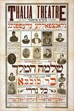 Avec l'émigration des Juifs d'Europe centrale, le théâtre essaime dans de nouveaux lieux : à Londres dans Whitechapel, Paris où Goldfaden établit une troupe et une école dramatique pendant peu de temps et surtout à New York dans le Lower East Side où un vrai théâtre populaire s'installe[2],[3],[4]. À Londres, les représentations évidemment jouées en yiddish étaient en grande majorité des mélodrames. Les théâtres juifs déclinèrent lorsque le public et les acteurs partirent pour New York ou des quartiers plus prospères de Londres[5].