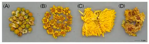 Les plantes utilisées pour le thé de chrysanthème[1] sont Chrysanthemum morifolium 菊花 (júhuā) ou chrysanthème d'automne et Coreopsis tinctoria ou chrysanthème des neiges, Coréopsis à fleur pourpre ou jaune[2]. Les cultivars et la période de récolte des fleurs influencent la composition de l'infusion et sa teneur en acide chlorogénique[1]. Il a été montré (2020) qu'un réseau neuronal profond appliqué sur l'image brute du thé donne 96 % et 89 % d'identifications correctes du stade de floraison et du type de thé de chrysanthème[1].